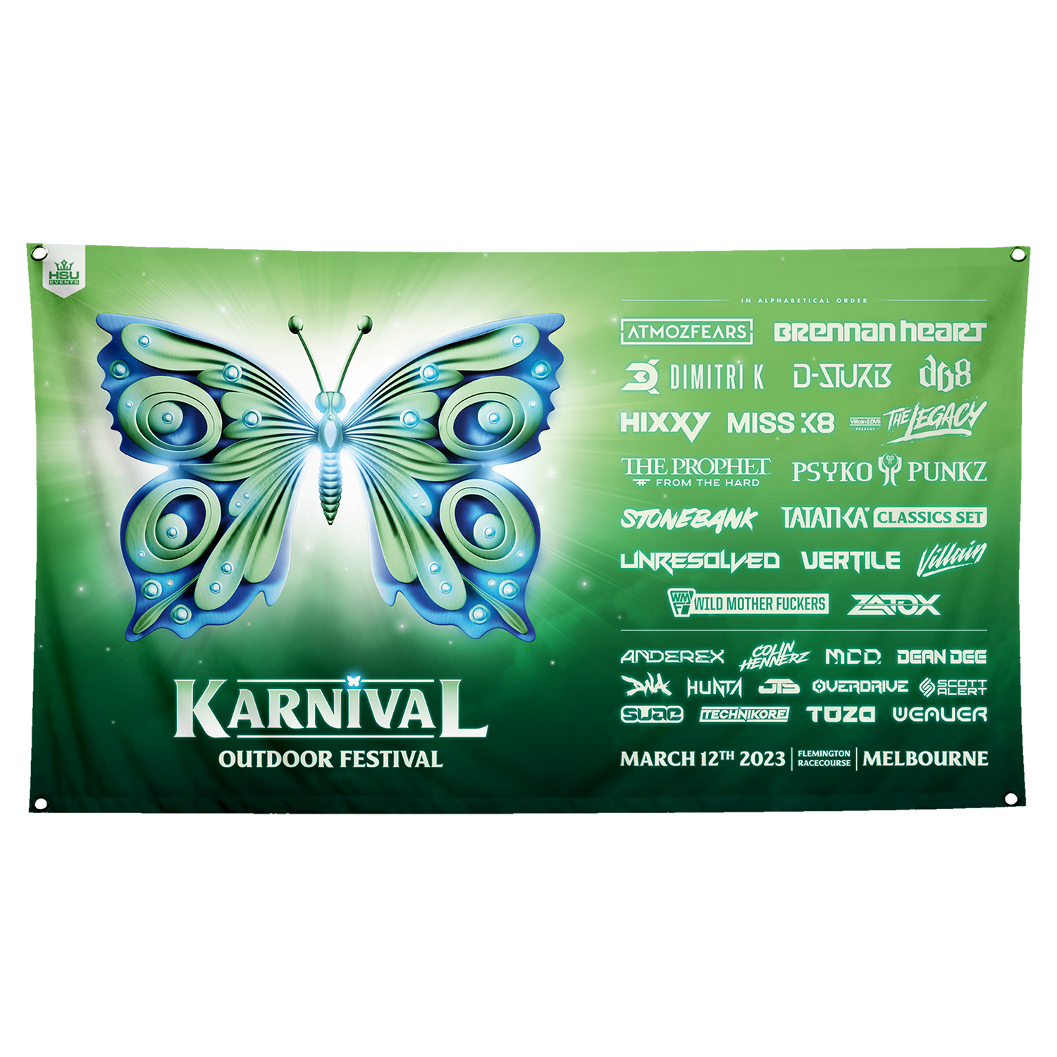 Wave the energy of KARNiVAL high with the 2023 Flag X Horizontal. Featuring the 2023 event line-up, this bold flag is the ultimate way to rep the movement and stand out in the crowd.