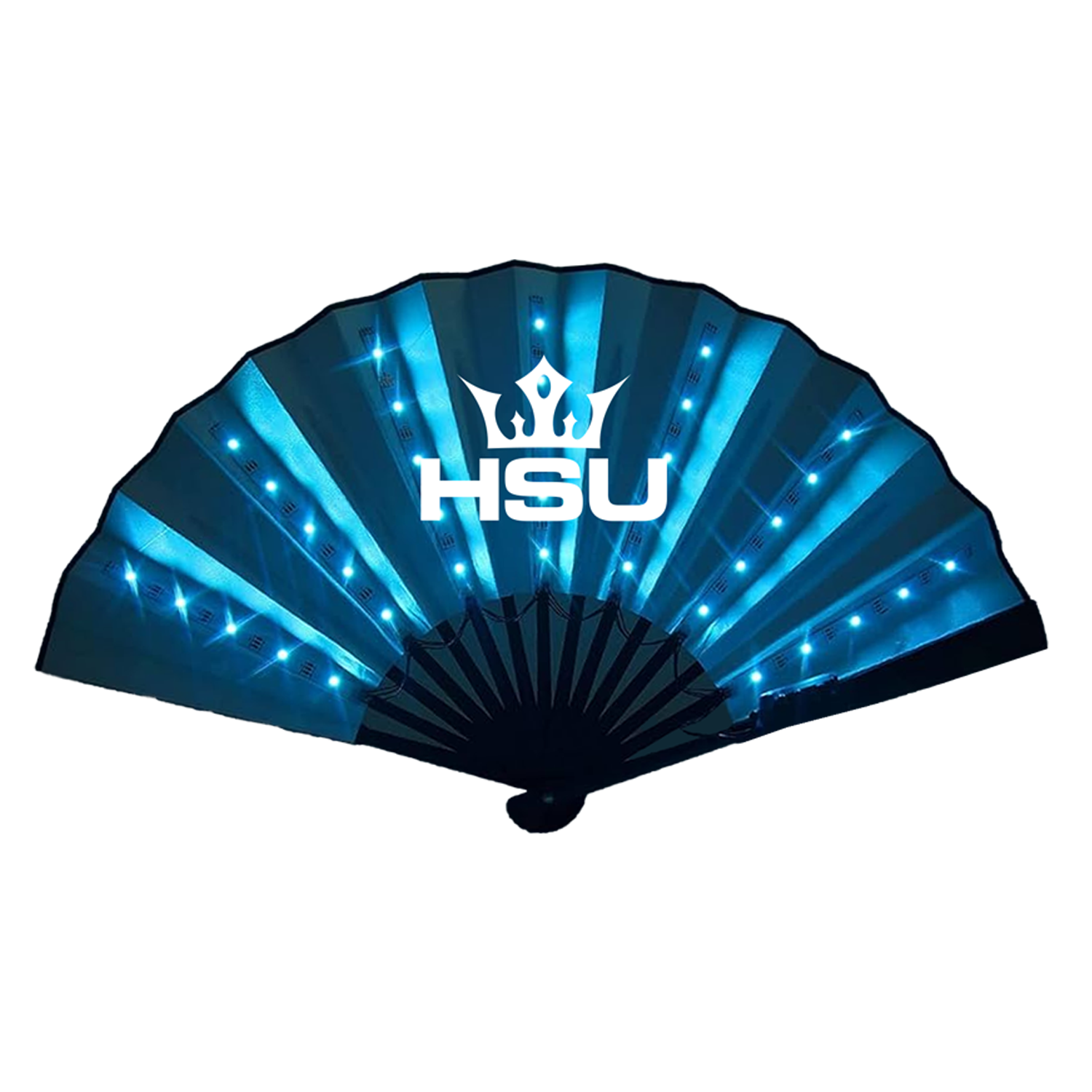 Make a bold statement with this large hand fan, featuring bright blue LEDs to light up, cool down and command the night. This is a collector's must have accessory.