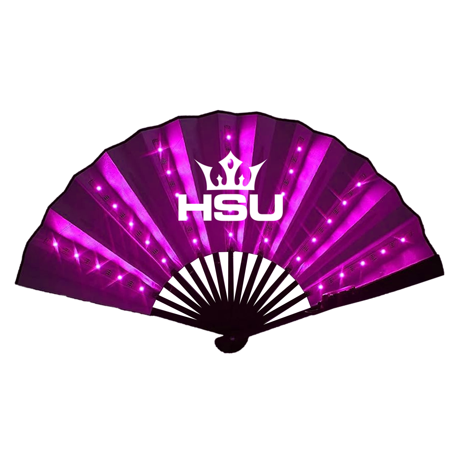 Make a bold statement with this large hand fan, featuring bright pink LEDs to light up, cool down and command the night. This is a collector's must have accessory.