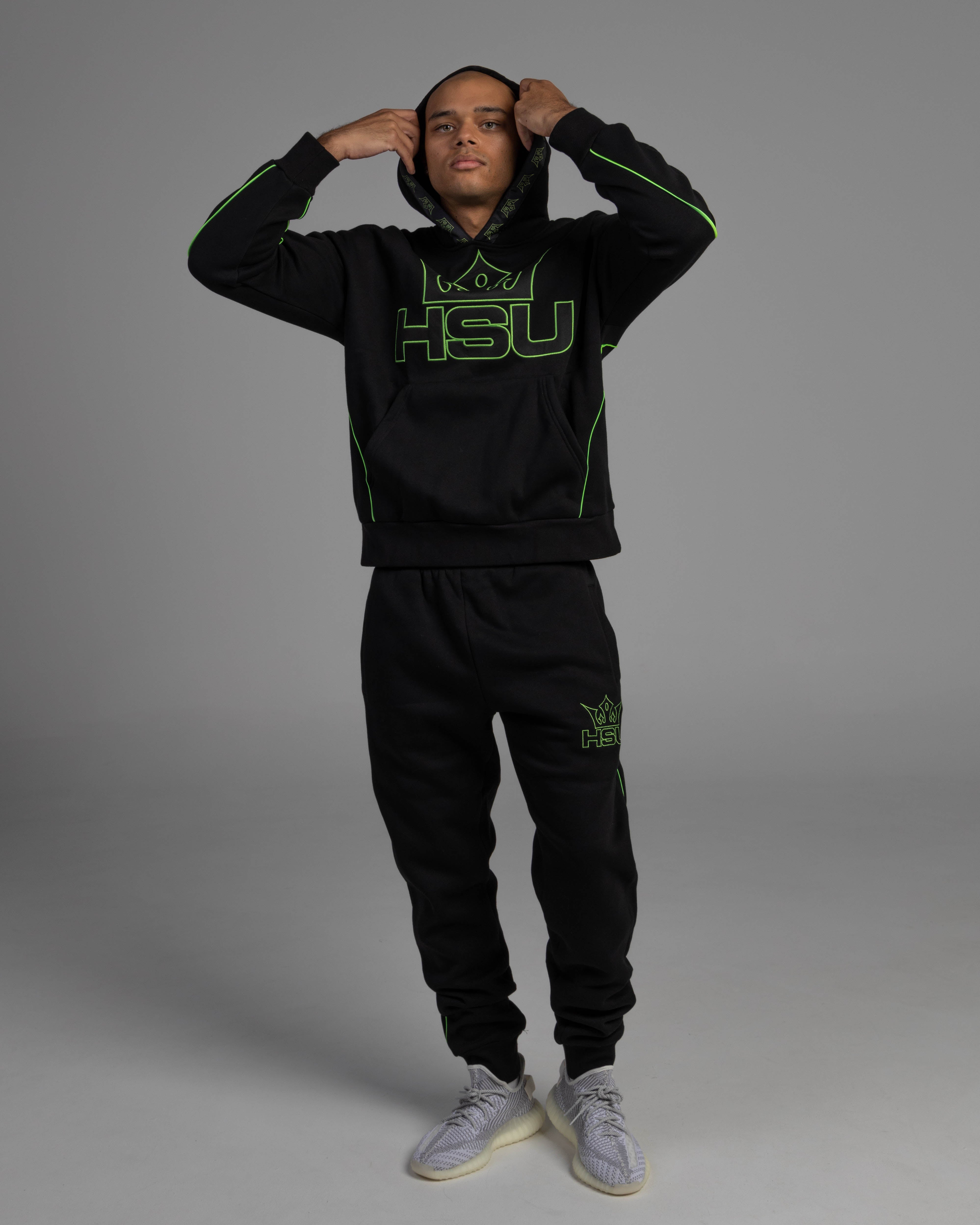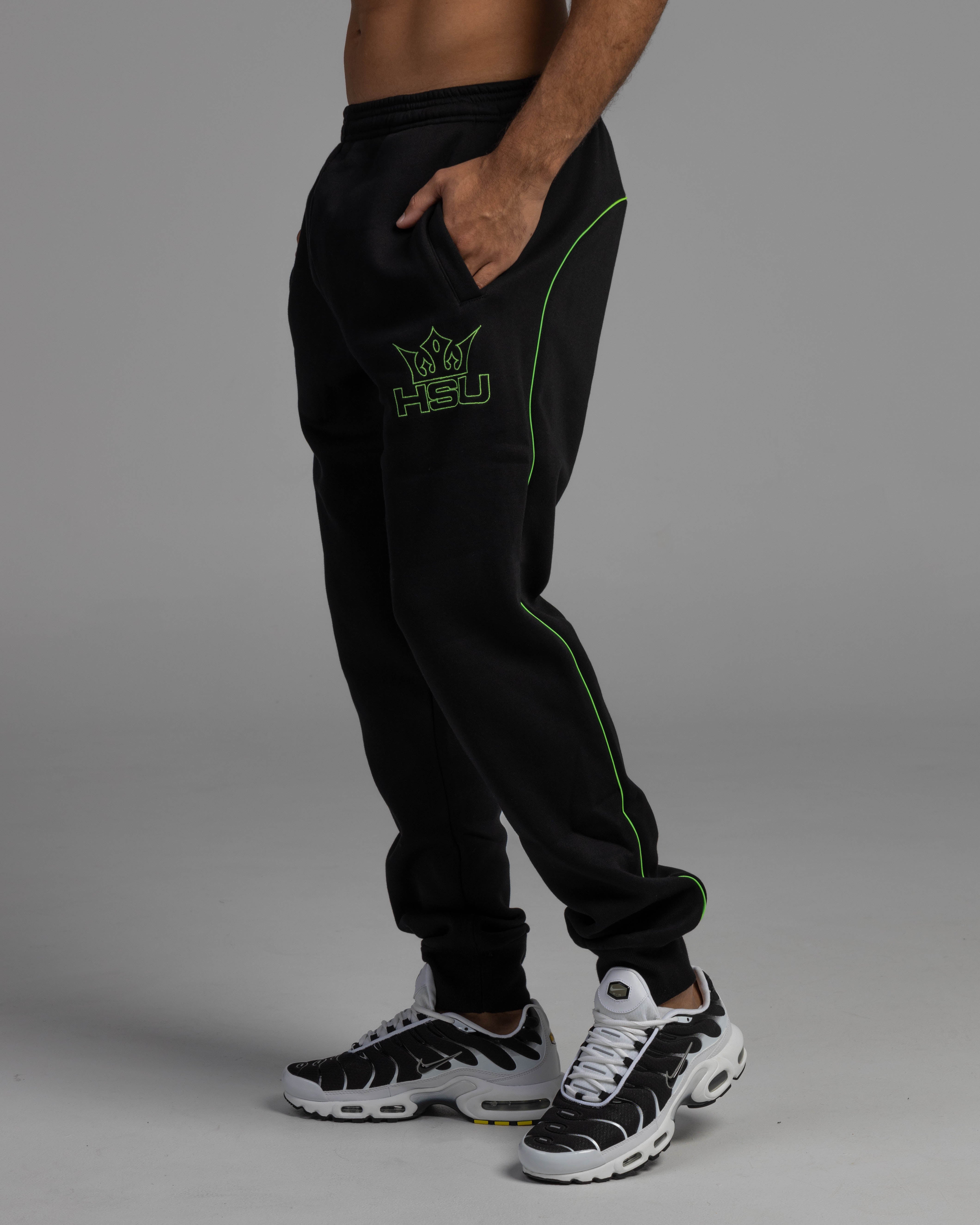 Introducing the HSU TRACK PANTS – BLACK & NEON GREEN, designed to turn heads while keeping you comfortable from the dance floor to the downtime. Made from premium 360 GSM polyester fleece, these pants deliver warmth, durability, and a soft, cozy feel. The bold neon green piping and embroidered HSU logo bring high-energy festival vibes with a sleek, tapered fit that moves with you—perfect for hacking, jumping, or just chilling in style.