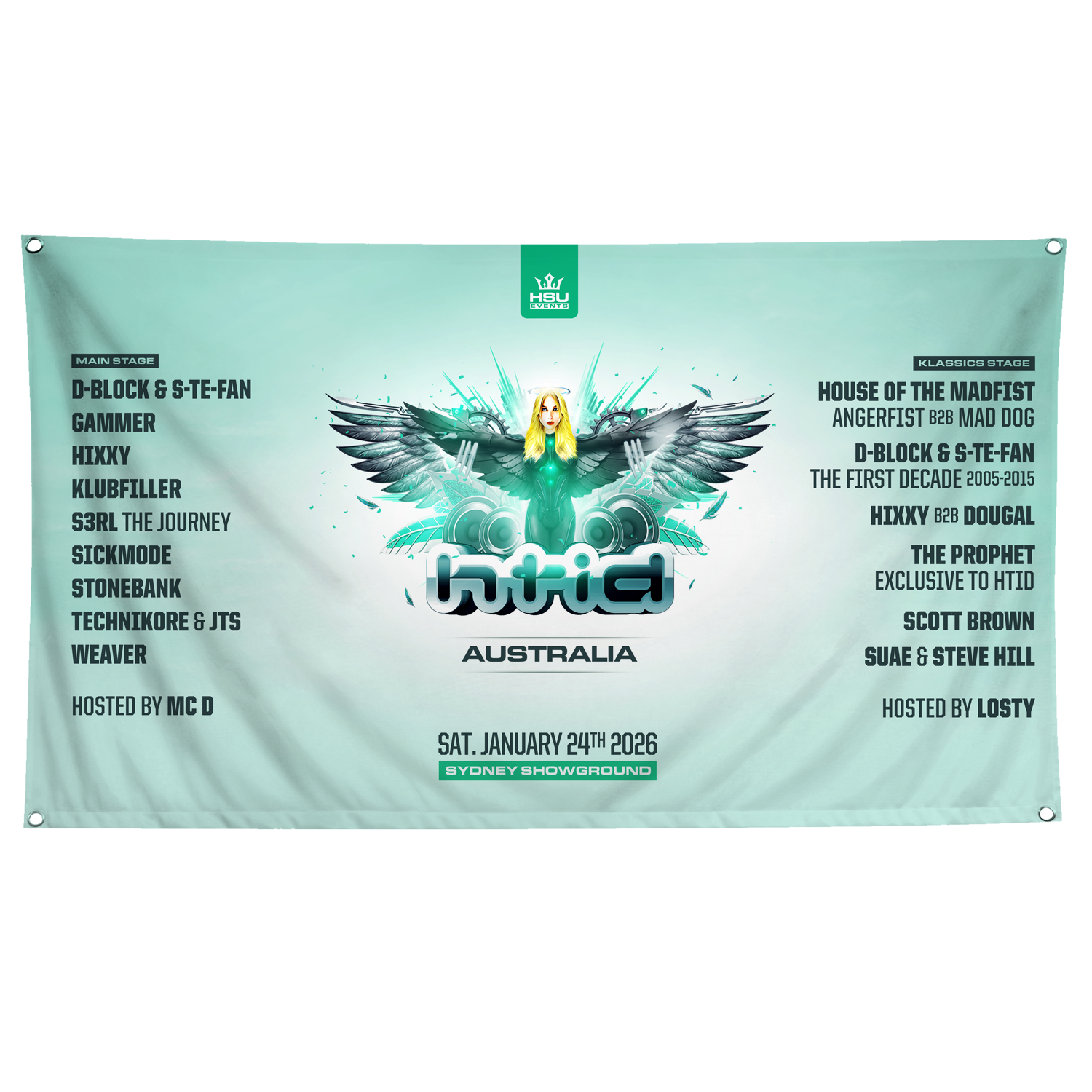 Printed with vibrant HTID 2026 artwork and full lineup details on high-quality fabric, it’s designed to stand out while holding up over time. Lightweight and easy to hang, this horizontal flag is a must-have for anyone wanting to showcase the energy and legacy of HTID 2026.
