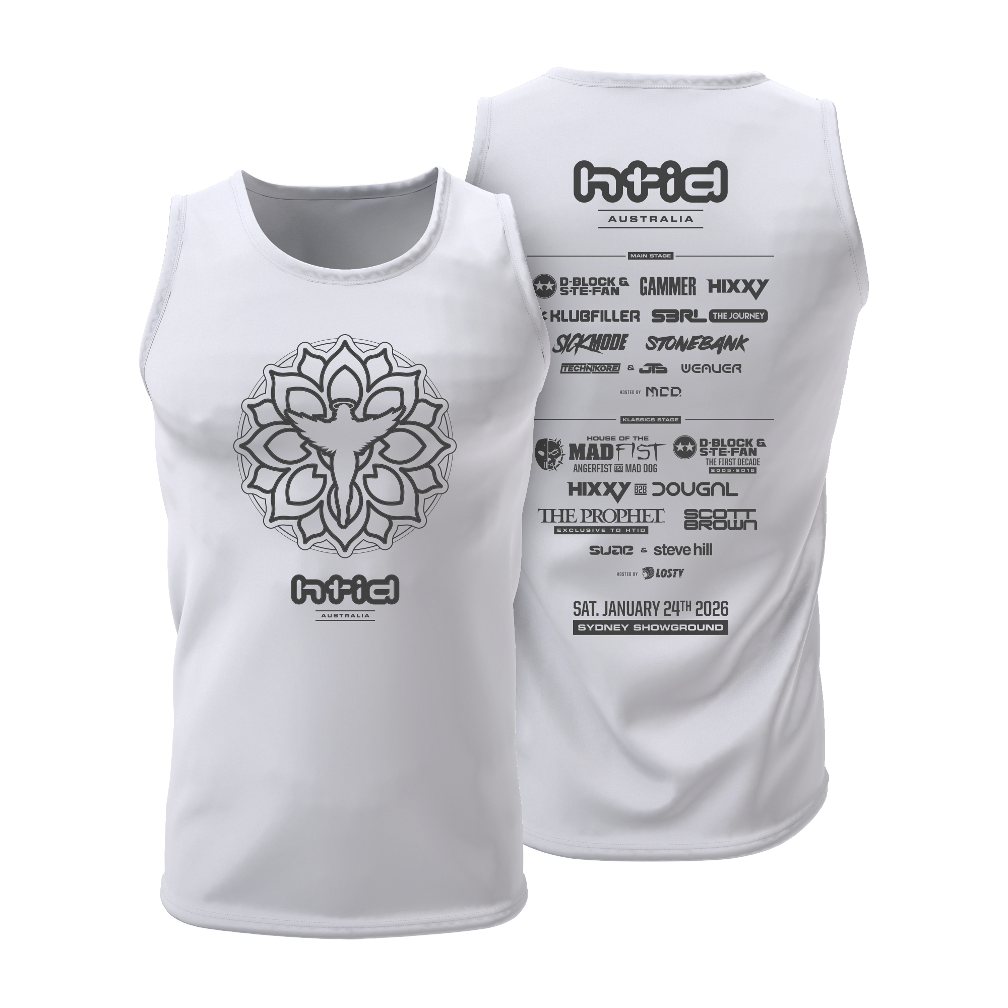 Crafted from breathable, performance-ready fabric, it’s designed to keep you comfortable while allowing full range of movement. Featuring clean HTID Australia branding on the front and the full HTID 2026 lineup printed on the back, this muscle singlet blends function with statement-level style for festivals, training, or everyday fits.