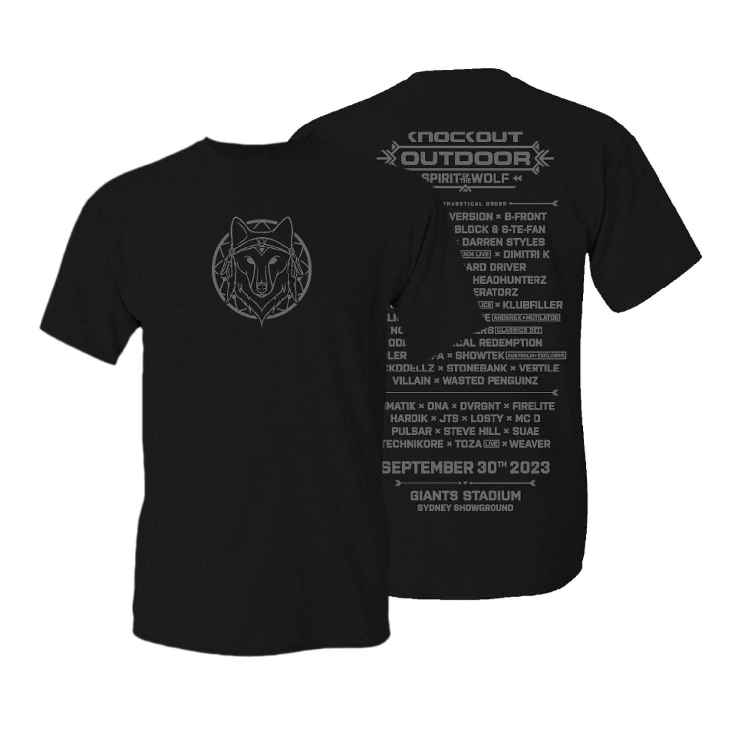 Limited edition event merchandise from Knockout Outdoor. Featuring the Spirit of the Wolf design and line up, this premium T-shirt is a collector's piece from the 2023 Knockout Outdoor: Spirit of the Wolf event.